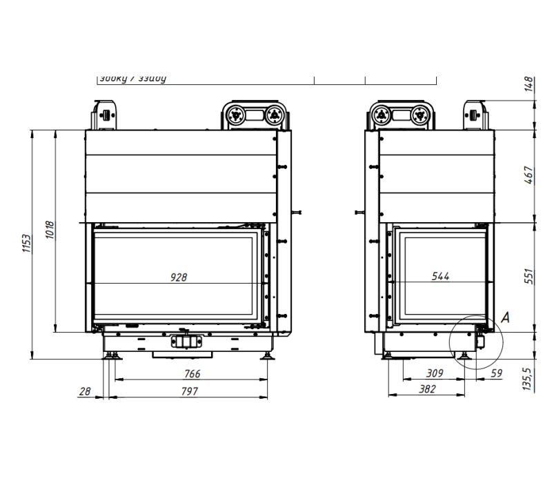 A special stainless steel moulding is installed on the inside of the door. This is an aesthetic solution that gives the fireplace a distinctive and finished look. Aesthetics are not the only function of this moulding: thanks to its good shielding, the door profile heats up less, and any heat that accidentally escapes beyond the firebox rolls back.