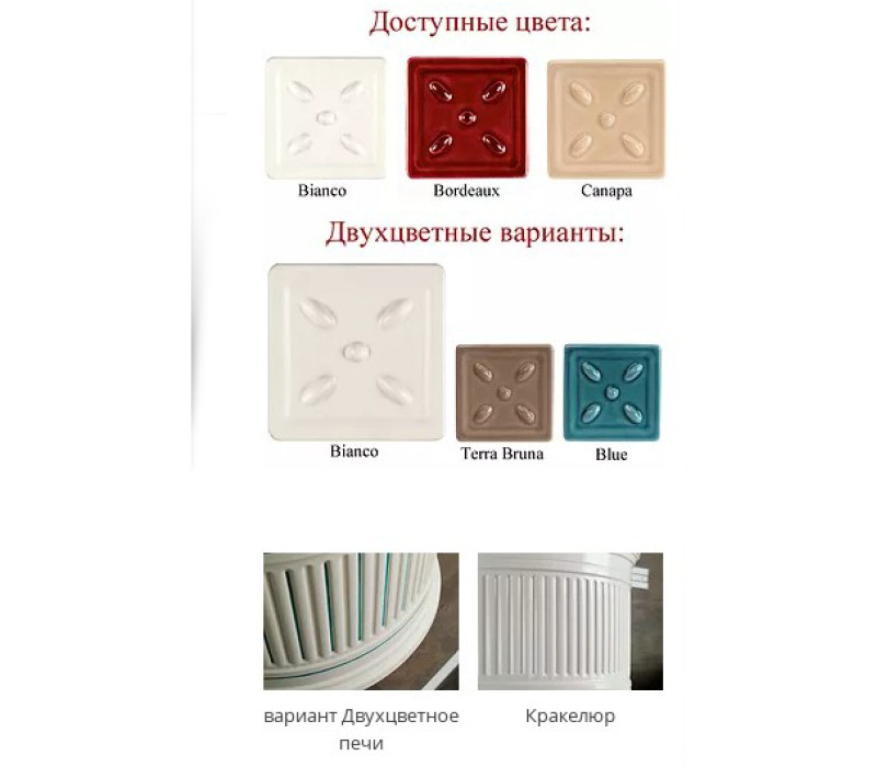 Facing of the stove - fireplace with majolica in colors: Bianco, Bordeaux, Canapa, also in two-color design.