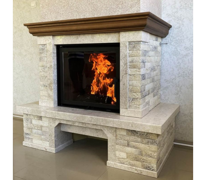 Словацький камін kobok топка Chopok L LD, облицювання мармуровий портал Markam Бьюга. Облицювання каміна Kobok в стилі кантрі з мармуру Delicato Cream з гіпсовими вставками і наявністю дерев'яно..