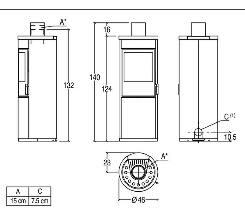Піч-камін має герметично закриваються дверцята зі склом для огляду.