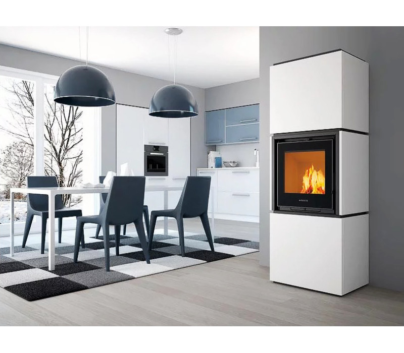 Дровяная печь Qube 4 в отделке из майолики, с естественной конвекцией и лучистым обогревом для помещений до 260 м3.