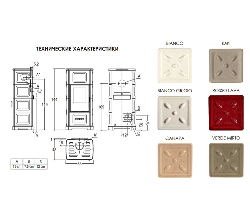 Дров'яній камін пiч Piazzetta E928 C в обробці з майоліки, з природною конвекцією і променистим обігрівом для приміщень до 315 м3.