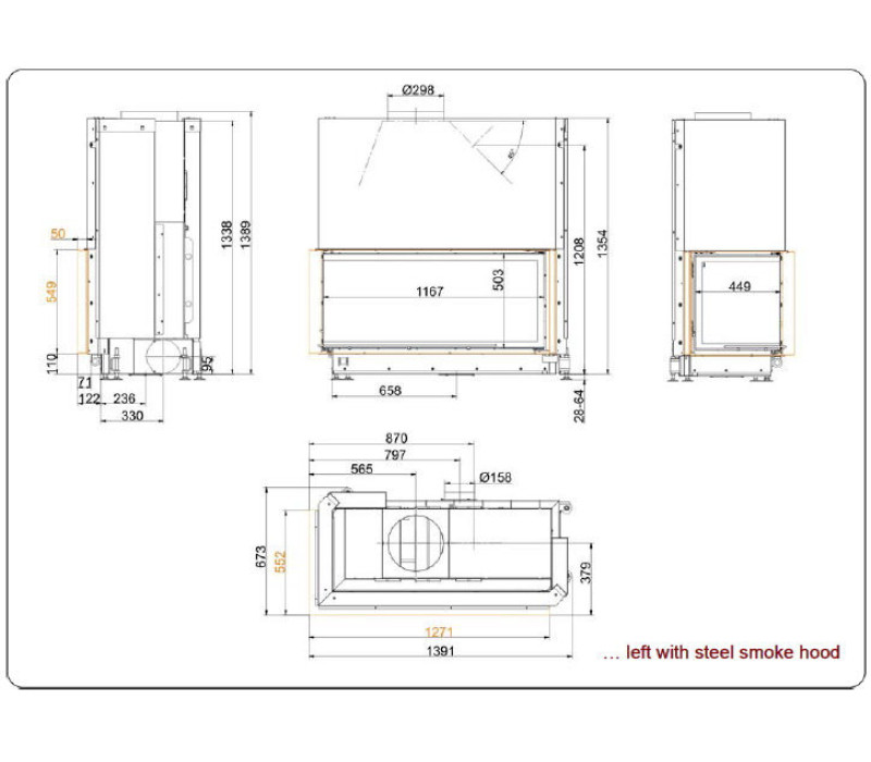 Топка Brunner Architektur-Kamin Eck 53/121/50 L Classic с угловом стеклом и подъемной дверцей - это современная, высокотехнологичная стальная топка подового горения, отличительной особенностью которой является дверца с большим стеклом, открывающая великолепный обзор пламени. Эта топка для настоящих ценителей огня, ведь ее можно эксплуатировать как с закрытой топочной дверцей, так и в ее открытом положении.