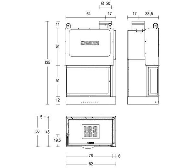 Корпус каминной топки выполнен с термоустойчивой высокоэластичной котловой стали толщиной 3 мм.Для высокой точности деталей резка производится с помощью современного лазера. Изгибание деталей происходит на современных, автоматизированных мощных станках CNC. Вырезанные и согнутые детали свариваются сварочным роботом методом MAG (автоматическая дуговая сварка металлическим электродом (проволокой) в среде защитного газа), что гарантирует получение высококачественных и эстетических швов.Для улучшения эксплуатационных характеристик компания Piazzetta покрывает корпус специально разработанной термоустойчивой эмалью. Использование эмали повышает температуру горения (за счет экранирования прямого теплового электромагнитного излучения), служит антикоррозийным барьером для стали, чем увеличивает срок эксплуатации топки. Благодаря дополнительному покрытию корпус топки не соприкасается с агрессивной средой огня.В процессе эксплуатации топка подвергается сильному температурному воздействию, происходит неравномерное увеличение деталей (температура в верху топки значительно выше чем в низу) соответственно происходит неравномерное линейное расширение деталей с большим поверхностным напряжением, и открывается возможность разгерметизации камеры сжигания со всеми негативными последствиями. Большинство производителей топок стараются использовать сталь толщиной от 4 мм, так сказать для надежности, но компания Piazzetta пошла другим путем. Проведя дорогостоящие исследования поведения стали при повышенных температурах смогли получить надежный сплав, который можно использовать даже при толщине 3 мм в камере сжигания, а дополнительное покрытие термоустойчивой эмалью защищает сталь от агрессивной среды кислот, выделяющихся в процессе горения дерева.В 1990 году проведя длительные исследование сгорания дров в каминах разработали уникальный шамотный материал для выкладки камеры сжигания Aluker. Применение шамотной футеровки в камере позволяет повысить температуру горения топлива до 30%, это происходит в следствии прямого отражения теплового электромагнитного излучения огня. Тем самым поднимая температуру в камере. Как известно, разные химические элементы имеют разную температуру сжигания. Процесс самовозгорания дерева происходит при 140°C. Чем выше температура тем больше частиц топлива сгорают что превращает газ и твердые частицы топлива в тепло, и соответственно повышается коэффициент полезного действия топки, уменьшается выброс сажи и вредных газов в атмосферу до 0,1%.Шамотный материал Aluker будучи абсолютно экологичным имеет впечатляющие характеристики он выдерживает температуру до 1400°C и остается устойчивым к механическим воздействиям.Компания Piazzetta запатентовала свою техническую разработку материал Aluker.