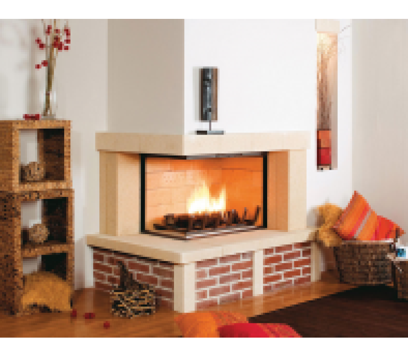 Ekko L-55(34)...H это элегантная каминная топка для угловых каминов, с цельным, угловым стеклом. Дверца топки открывается вверх, а также в сторону для чистки стекла. Левый вариант (L).