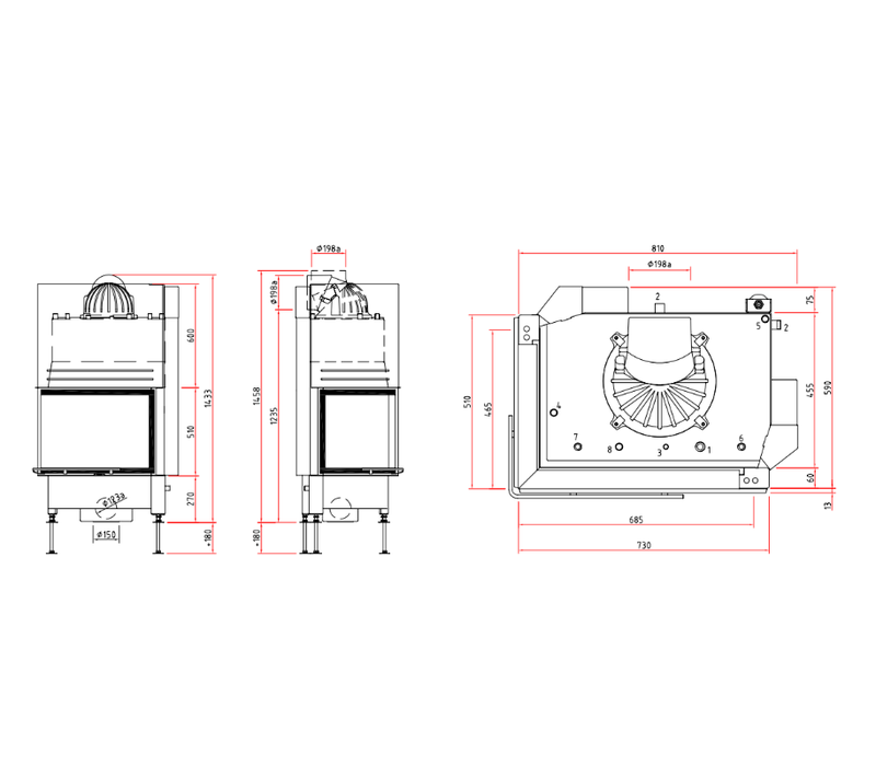 Корпус топок компании Schmid изготовлен из специальной стали толщиной от 4-х до 5 мм в наиболее уязвимых местах. Это жаропрочная нелегированная сталь, обладает свойствами не деформироваться при высоких температурных нагрузках.Внутри каждая топка выложена огнеупорным шамотом. Использование этого материала проверено десятилетиями, он лучше всего подходит для внутренней облицовки камина, обладая высокой теплопроводностью и равномерной медленной теплоотдачей. Кроме того, он прочен, долго служит, не теряя своих свойств.Устройство на выходе топки не может быть внутри облицовано шамотным кирпичом, как внутренняя камера горения. В нем возникает самая высокая температура и сталь непригодна для этого узла каминной топки. Поэтому в топках Schmid используются дымосборники (вытяжки), выполненные из чугуна марки Кonigshutte. Производство Кonigshutte существует около 3-х столетий, чугун для топок, который выпускается на этой фабрике относится к классу жаропрочных, обладает отличными химическими свойствами и техническими характеристиками. Специальная марка чугуна (GGL15 - c ламельным графитом, минимальный предел прочности —150 Н/мм2) гарантирует надежность и длительный срок службы, как дымосборника, так и каминной топки.Толщина чугуна в зоне высокой температуры достигает 8-15 мм, несколько утяжеляет конструкцию топки, но предотвращает ее от поломок и соответствует требованиям безопасности. На дымосборном устройстве установлен поворотный механизм подсоединения к дымоходу.