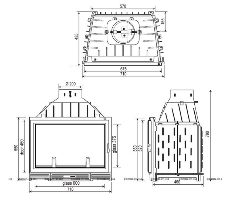 Диаметр дымохода 200 мм. В передней части камина находится защитный барьер, который предотвращает выпадение