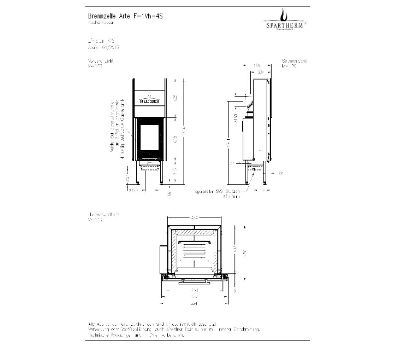 Боковые и задняя стенки каминной топки Spartherm Arte F-1Vh-4S покрыты радиаторами (специальными ребрами) для увеличения теплопроизводительности. Размеры топки: габаритная ширина - 515 мм, ширина фасада: 470 мм, глубина: 558 мм, высота: 1585 мм. Размер дверцы топки: 396x803 мм, вес: 180 кг. Тип открывания дверцы: гильотина. Для модели Spartherm Arte F-1Vh-4S обрамление исполнено в версии Linear 4S - четырехсторонняя стеклокерамическая окантовка стекла. Внутренние стенки камеры сгорания топки футеровано шамотом, что положительно влияет на КПД и температуру горения.