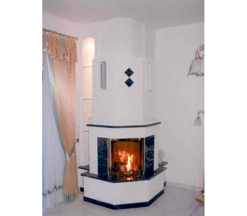 - система длительного горения и вторичного дожигания, суть которой - регулируемая подача воздуха снизу и сверху топки, обеспечивает быстрое интенсивное возгорание, длительное равномерное горение и тление древесины, экономный расход его, полное дожигание отходов и выхлопных газов. Длительность работы топки от одной закладки дров – более 10-ти часов. После окончания долго сохраняется тепло в доме благодаря высокой теплоотдаче материалов каминной топки;