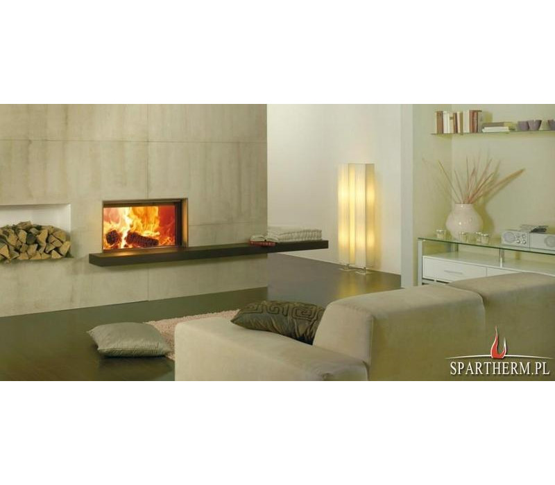 Топка Spartherm Varia Ah 3S 2 нового поколения с подъёмным механизмом двери. Дверца с большим керамическим прямоугольным (16/9) стеклом, которая открывается вбок и вверх. Шамотный кирпич внутри топки увеличивает температуру в топке, накапливает это тепло во время работы топки, и длительное время излучает его после окончания процесса горения.