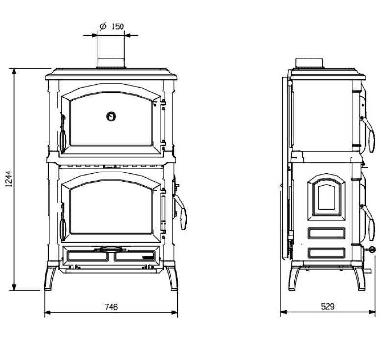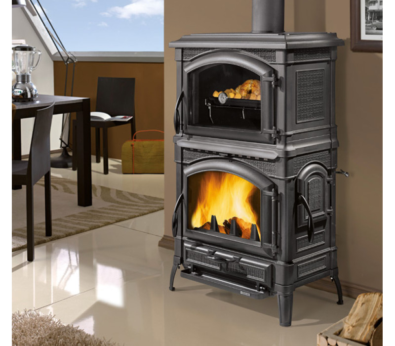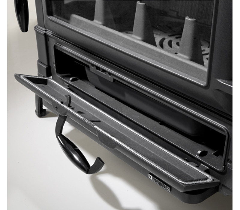 Печь Isotta Forno Evo с духовкой выполнена из высококачественного чугунного сплава, который хорошо накапливает и отдает тепло от очага. Духовка для приготовления еды объёмом 39 л, изготовлена из эмалированного чугуна. Печь оснащена боковыми дверцами для удобства загрузки дров. Чугунная печь Nordica Isotta Forno Evo имеет двойные стенки, панорамные дверцы с большим стеклом обеспечивают прекрасный обзор огня. Стекло печи изготовлено из стеклокерамики, устойчивой к температурам до +750°. При открытии дверей сажи не попадет на пол, поскольку внизу есть небольшой поддон.