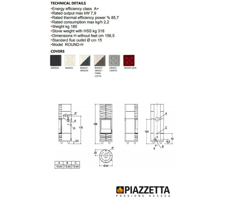 Дров'яна піч камін Piazzetta ROUND H BSC в обробці з майоліки, з природною конвекцією і променистим обігрівом для приміщень до 230 м3.