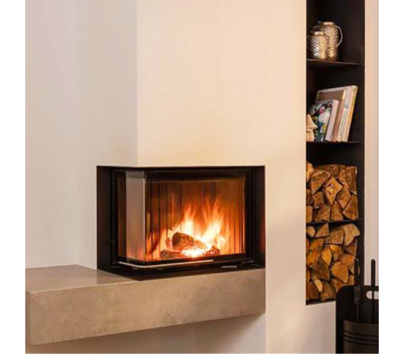 - стекло: панорамное угловое стекло дает превосходный обзор огня, добавляя уюта и подчеркивая современный стиль интерьера;
